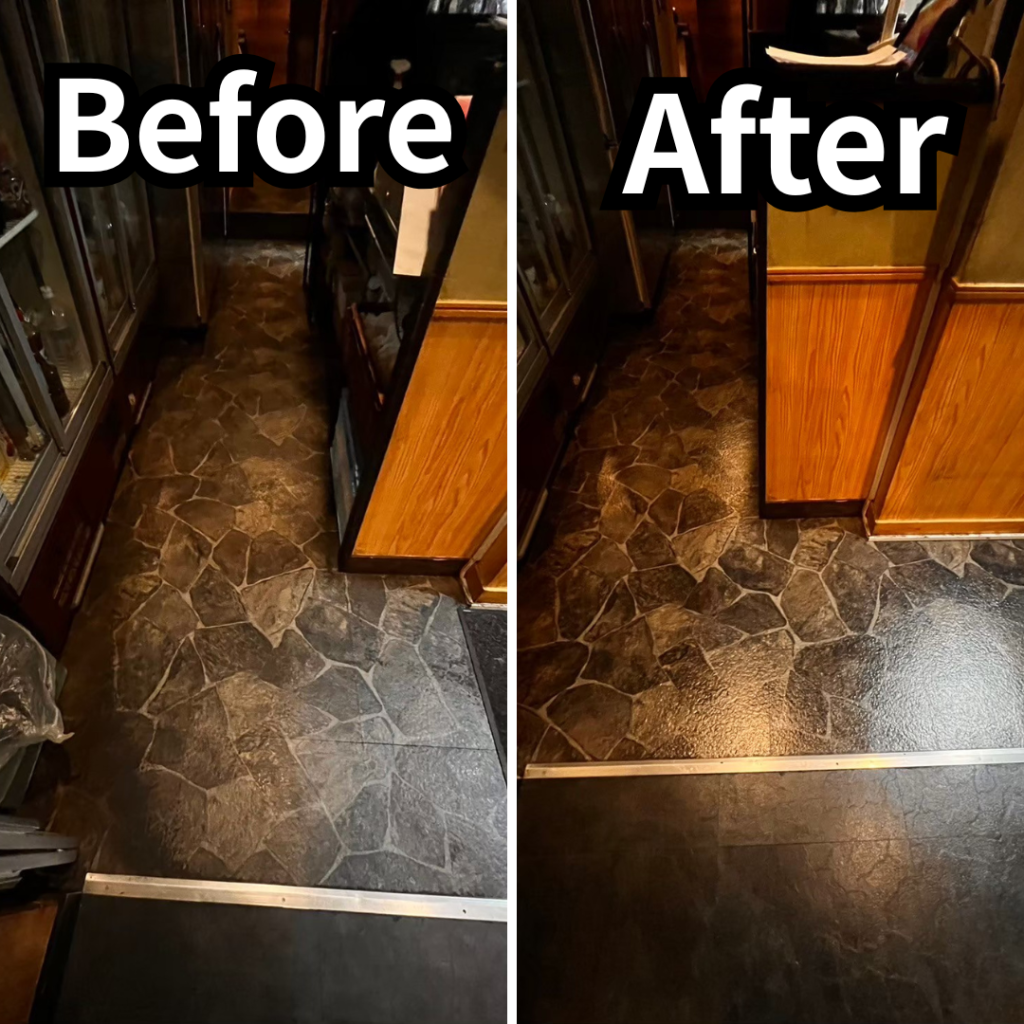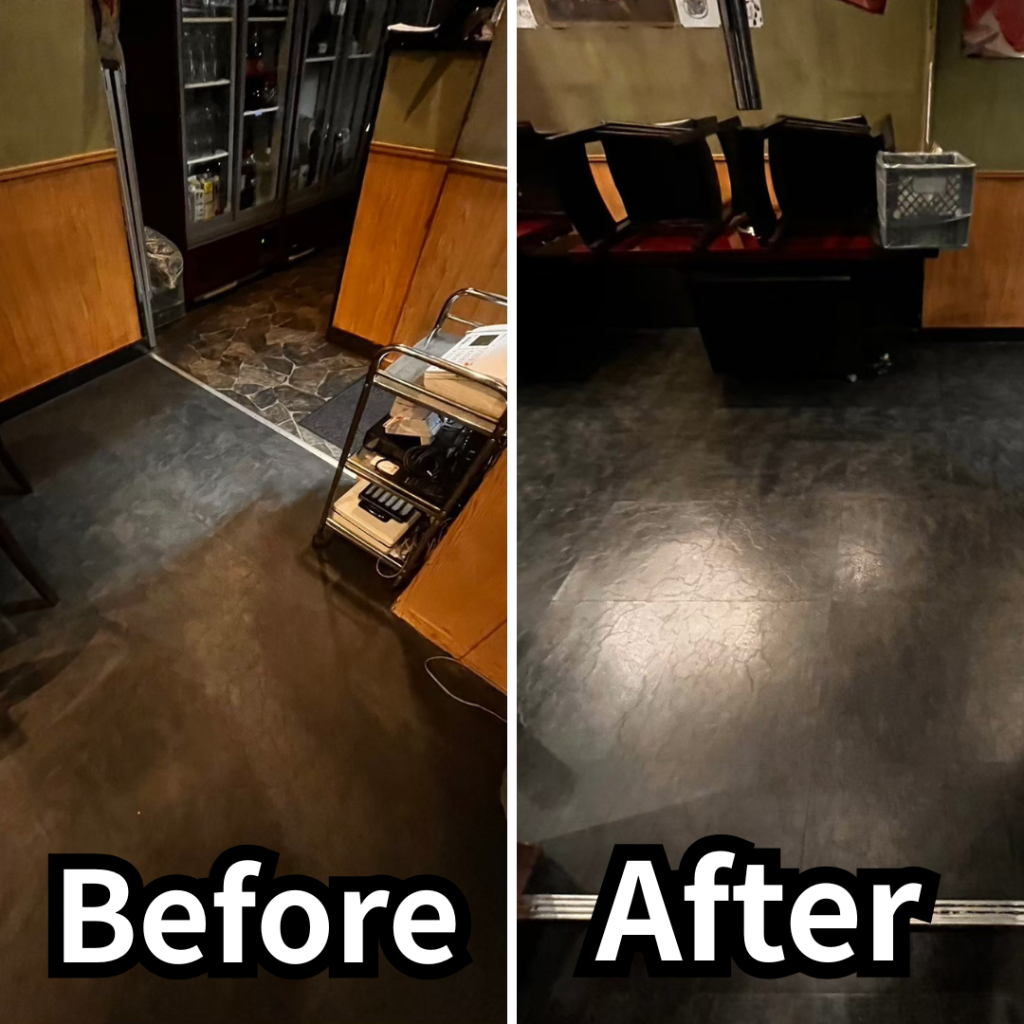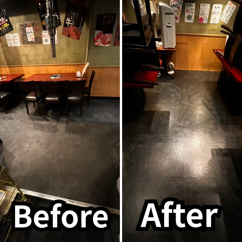 油膜や長年の汚れをしっかり取り除いた結果、床本来のツヤ感がよみがえり、店内が明るく清潔な印象 に変わりました。