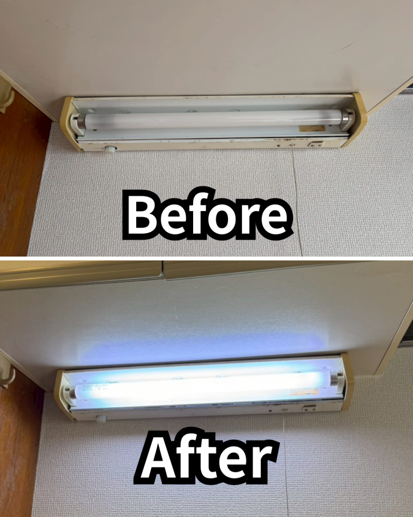 既存の照明はカバーが割れており、変色や汚れも目立っていました。照明カバーの破損は見た目の問題だけでなく、破片落下の危険や、明るさのムラにつながることもあります。