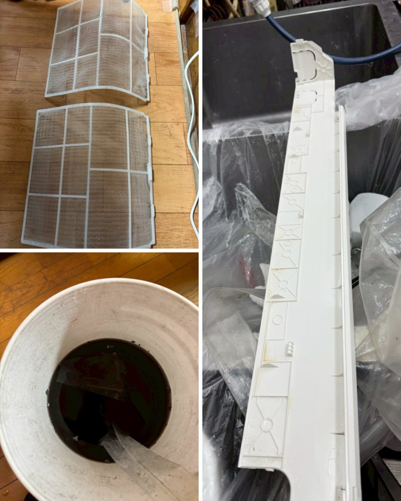 今回の現場でも、外側は一見そこまで汚れていないように見えましたが、部品を取り外して確認すると、フィルターやカバーまわり、内部の熱交換器付近などに汚れの蓄積が見られました。普段のお掃除では対応しきれない箇所に汚れが残ってしまうのは、店舗用エアコンでは珍しいことではありません。