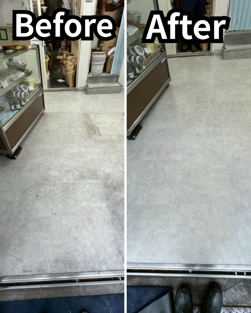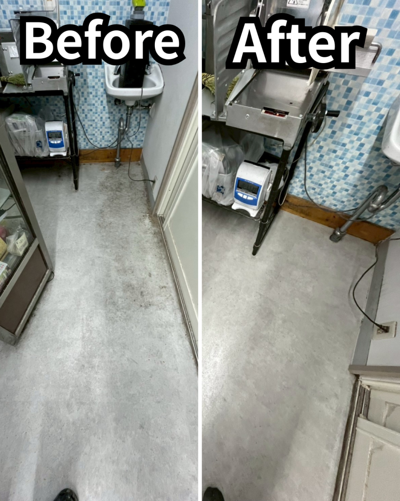 店舗では、毎日の掃き掃除や拭き掃除を行っていても、通路や入口付近、作業スペースまわりなどは、少しずつ汚れが蓄積していきます。