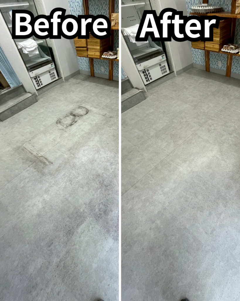 床に黒ずみや擦れ跡、蓄積した汚れがあると、毎日しっかり営業しているお店でも、どこか古びた印象や管理が行き届いていない印象につながってしまうことがあります。反対に、床が整っていると、店内全体が明るく見え、空間そのものがきちんと管理されている印象につながります。