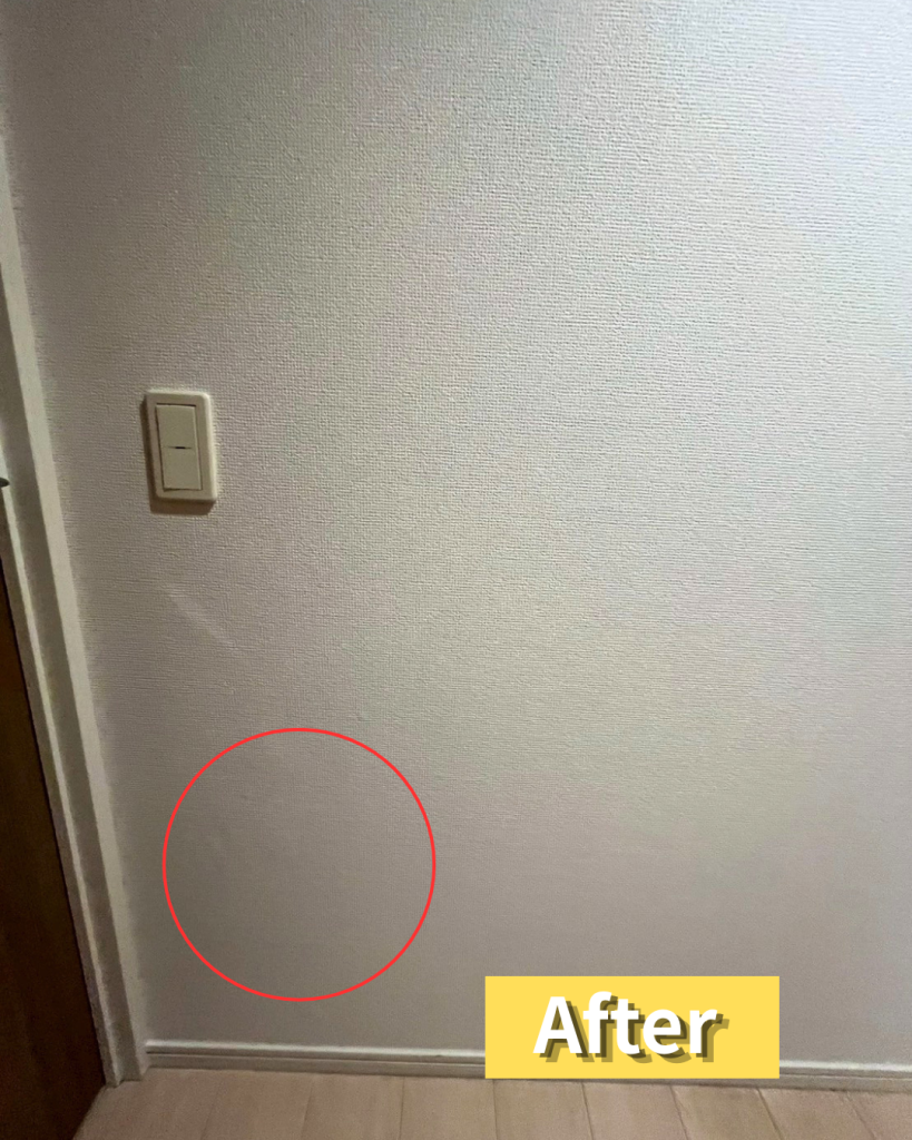 壁の状態に合わせて補修部分を整え、周囲となじむように仕上げることで、違和感をできるだけ抑えた自然な見た目を目指しました。