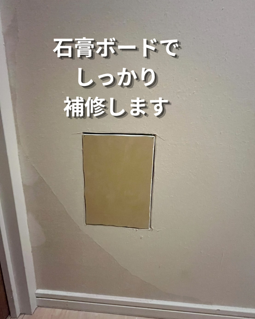 表面だけを埋めるのではなく、今回は石膏ボードを使って下地からしっかり補修しています。